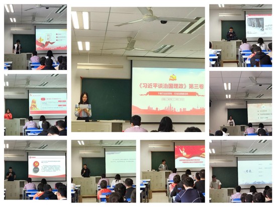 经过两周时间准备,同学们对《习近平谈治国理政》第三卷进行了充分学习。陈晓文通过赏析《共谋绿色生活,共建美丽家园》中引用的“取之有度、用之有节”倡导实施简约适度、绿色低碳的生活方式,让生态环保实现成为社会生活的主流文化;赵旭瞳、王勇志通过赏析《努力成为世界主要科学中心和创新高地》中引用的“吾心信其可行,则移山填海之难,终有成功之日;吾心信其不可信,则反掌折枝之易,亦无收效之期也”激励同学们发挥主观能动性,为建设创新型国家贡献自己的青春力量;李亚茹、胡宇扬、张立国通过赏析《坚持和完善中国特色社会主义制度、推进国家治理体系和治理能力现代化》中引用的“凡将立国,制度不可不察也”“千磨万击还坚劲,任尔东西南北风”,以疫情防控为例,展示了中国特色社会主义制度的优越性;王菁通过赏析《加强生态文明建设必须坚持的原则》中引用的“天地与我并生,而万物与我为一”,重温“绿水青山就是金山银山”理念并结合垃圾分类等重点问题,呼吁同学们正确认识人与自然关系;凌化旭通过赏析《重整行装再出发,以永远在路上的执着把全面从严治党引向深入》中引用的“怀江上之清风,与山间之明月,耳得之而为声,目遇之而成色,取之无禁,用之不竭”告诫同志们对功名利禄要知足,对物质享受和个人待遇要知止,以清廉养浩然正气;沈琪彬通过赏析《发扬五四精神,不负伟大时代》中引用的“天将降大任于斯人”,勉励同学们继续发扬五四精神,以实现中华民族伟大复兴为己任,不辜负党的期望、人民期待、民族重托,不辜负我们这个伟大时代。展示结束后,在场的党员纷纷表示受益良多,积极发言与大家分享此次学习的心得感受。