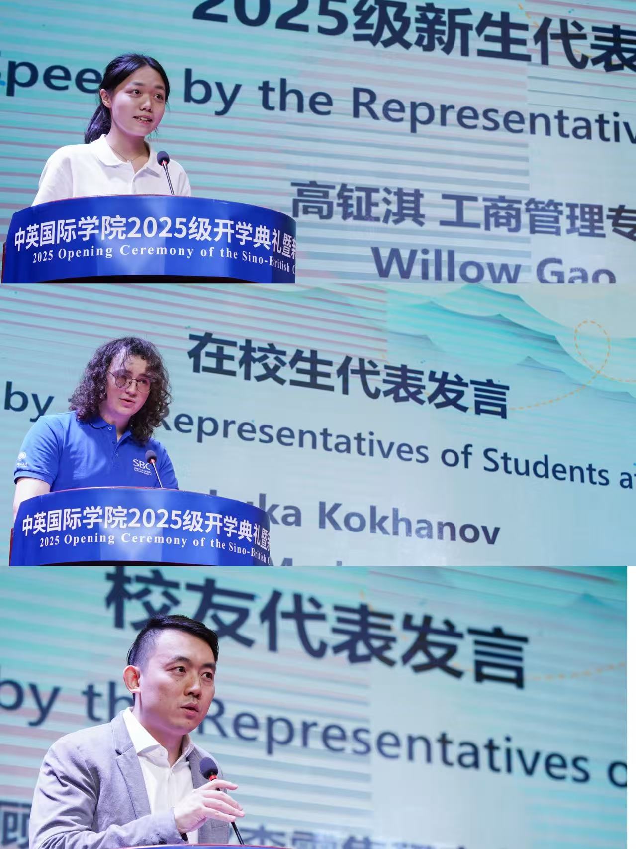 接下来,2025级新生代表高钲淇分享了初入学院的喜悦与憧憬,希望能与所有新生同学们一起勇于探索、敢于创新,在国际化校园里拼搏出属于自己的精彩。在校生代表Luka Kokhanov也分享了自己在SBC求学的感受,作为一名国际留学生,期待能与新生同学们组织和参加丰富多彩的跨文化活动,共同感受中国优秀传统文化的魅力。2008级校友代表、尼尔森零售研究负责人顾问结合自身成长与职场经历,鼓励同学们要专注学业的同时,也要勇敢的走出去看世界,感受不同地域的文化风貌,在开阔国际视野的同时,不断提升和超越自我。