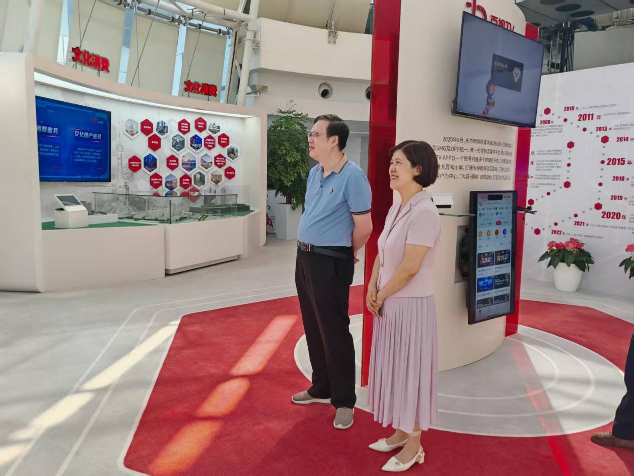 在黄凯的陪同下,外语学院一行参观了东方明珠新媒体股份有限公司的企业展示区。参观过程中,黄凯详细介绍了公司的发展历程、核心业务布局以及在媒体融合与数字化转型方面的战略实践与创新成果。
