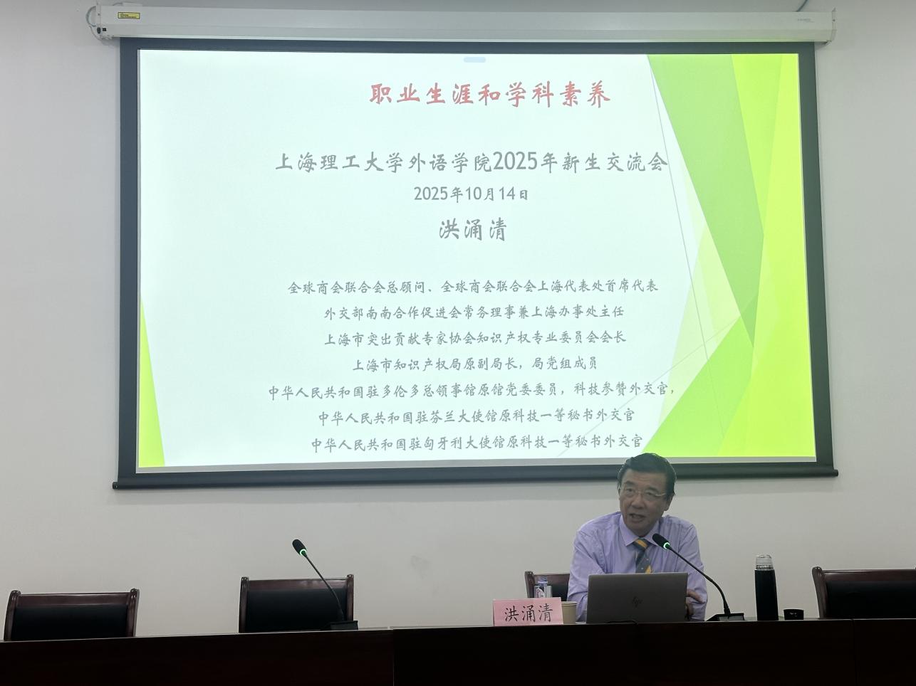 10月14日下午,外语学院举办职业生涯教育专题讲座,特邀外语学院校友理事会会长、上海市知识产权局原副局长洪涌清先生主讲。本次讲座也是外语学院针对大一新生开设的《职业生涯与学科素养》必修课程的其中一讲,讲座由外语学院学业发展中心指导老师苏予燕主持,全体大一新生、高年级本科生及研究生代表参加。