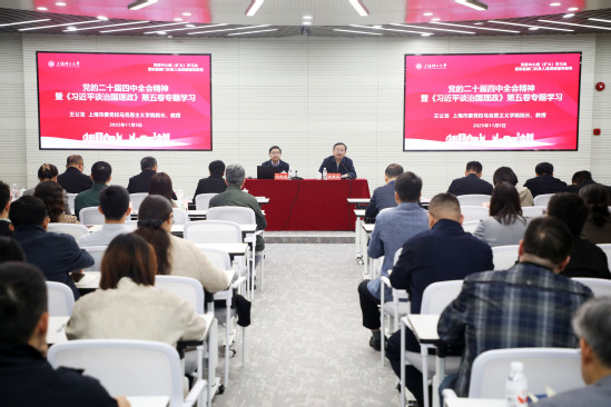11月5日下午,上理工举行党委理论学习中心组(扩大)学习会暨职能部门负责人培训班辅导报告,上海市委党校马克思主义学院院长王公龙教授受邀做“党的二十届四中全会精神暨《习近平谈治国理政》第五卷专题学习”辅导报告。报告会由校长朱新远主持,全体校领导、中层干部参会。
