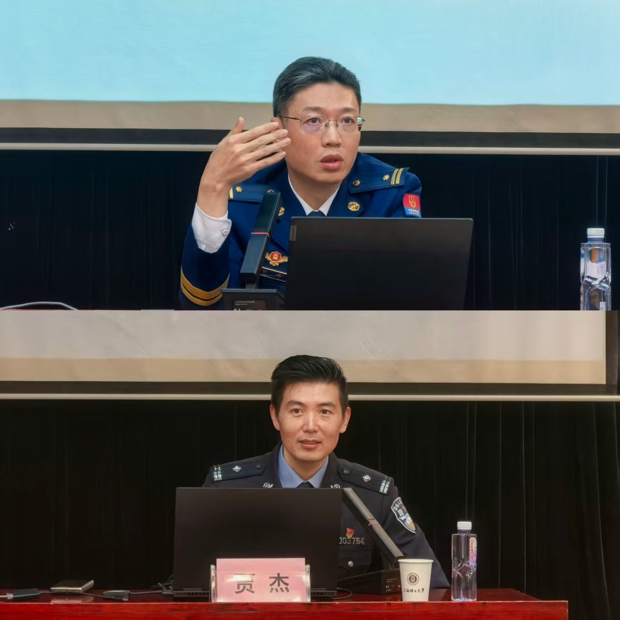 薛波以“高等院校火灾成因、风险及处置逃生”为题作报告,他通过高校校园火灾的真实案例,详细剖析了宿舍违规用电、电动车充电、实验室操作不当等常见隐患的成因与危害,重点讲解了火灾初期的判断、火场疏散逃生要点等内容,切身增强同学们的消防防范意识。贾杰的交通安全讲座内容涵盖了交通信号灯规则、骑行头盔正确选用、大车盲区风险识别等关键安全知识,结合典型交通事故案例进行警示,并运用实验数据对比,直观揭示不同撞击速度下事故后果的差异性,从而强化学生对交通事故危害性的理性认知。两位警官的讲解风格专业严谨又不失生动幽默,其内容紧密贴近学生的实际生活,寓教于乐的讲授方式赢得了全场师生的热烈掌声。