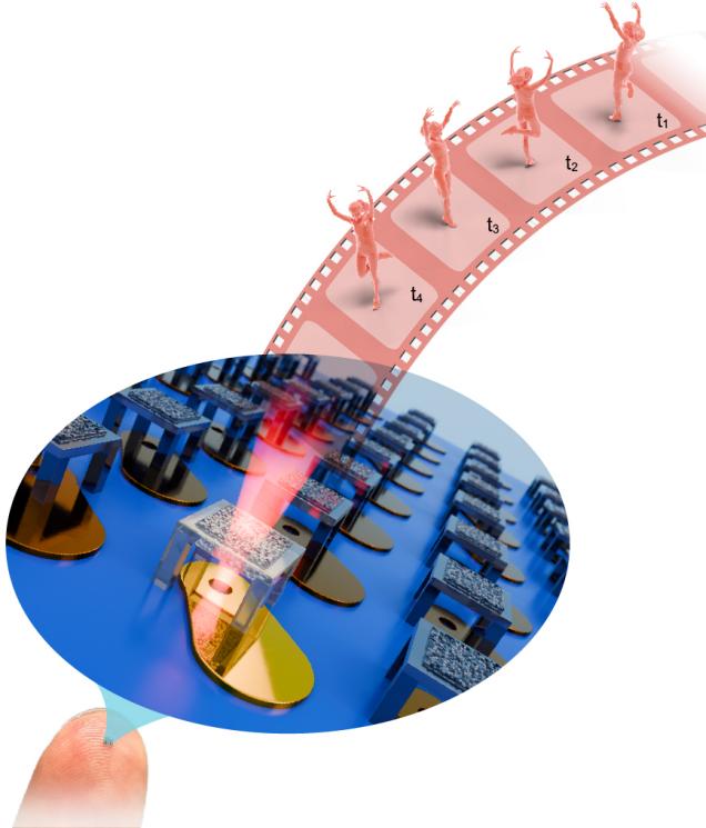 实现芯片化的关键,是团队采用的3D激光纳米打印技术,他们在比头发丝还细的激光器端面上,直接“雕刻”出精细的光学结构。每个单元只有100微米见方,却集成了激光源和全息器件于一身。团队构建了2×2阵列的芯片,实现1.93 GHz的超高全息刷新速率,比现有商用全息设备快六个数量级。这意味着它可以在1秒内完成传统设备需要一个月才能完成的全息帧切换。更值得一提的是,该芯片还具备动态3D显示能力,通过切换不同注入电流,可在不同成像平面呈现清晰的全息图像。