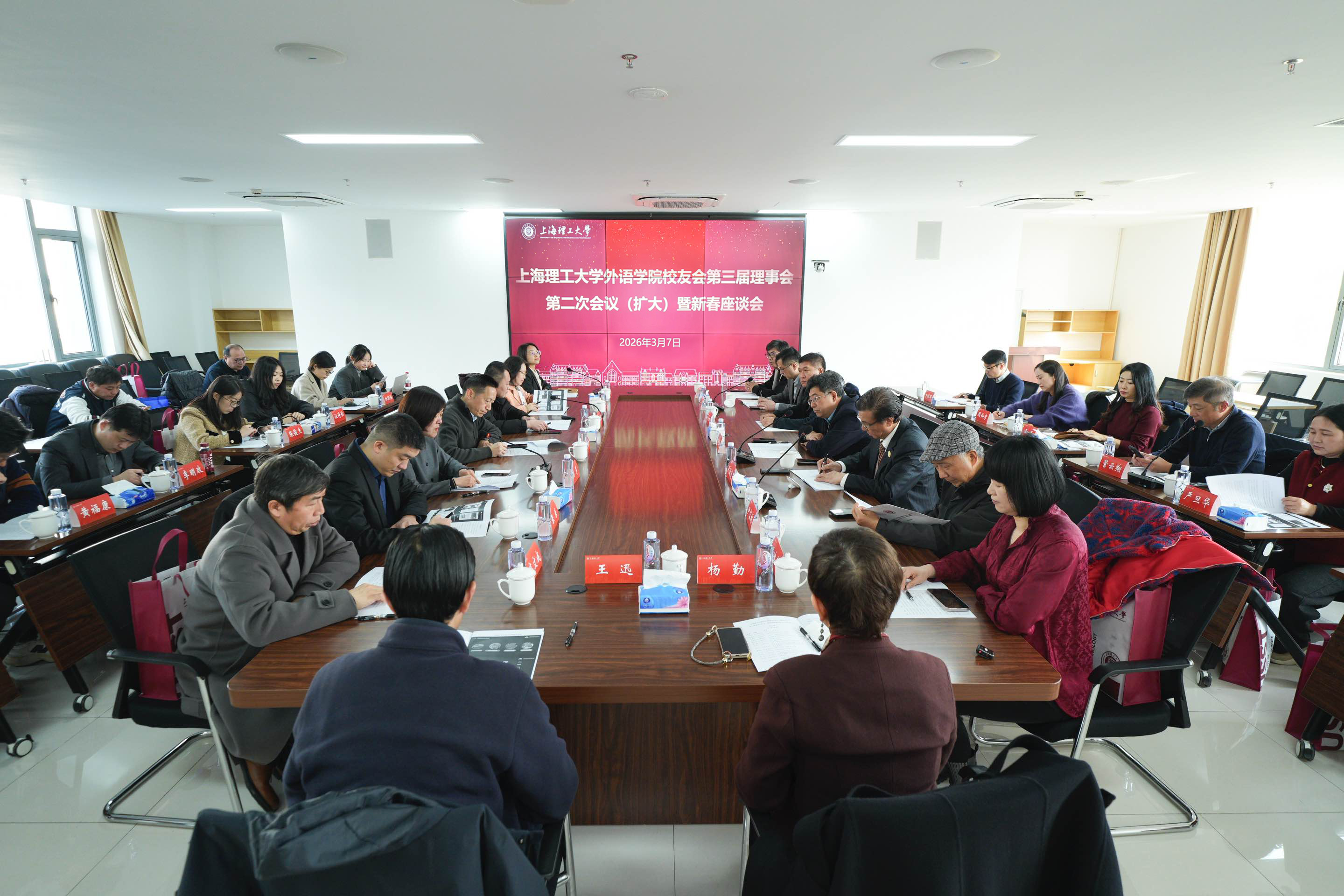 3月7日下午,上海理工大学外语学院校友会第三届理事会第二次会议(扩大)暨新春座谈会在国合楼407会议室举行。外语学院1985级科技英语专业校友、同济大学常务副校长吕培明,上海理工大学党委副书记、副校长刘德强,校友工作处处长曲德强、外语学院党政领导班子成员、校友理事会成员、特邀教师代表及校友代表齐聚一堂,共叙情谊、共谋发展。会议由外语学院党委副书记沈莲莲主持。