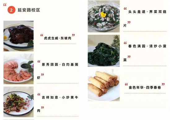 延安路校区,有虎虎生威的东坡肉、景秀团员的白灼基围虾、吉祥如意的小炒黄牛肉、头头是道的荠菜双菇、春色满园的清炒小菠菜、金色年华的四季春卷。