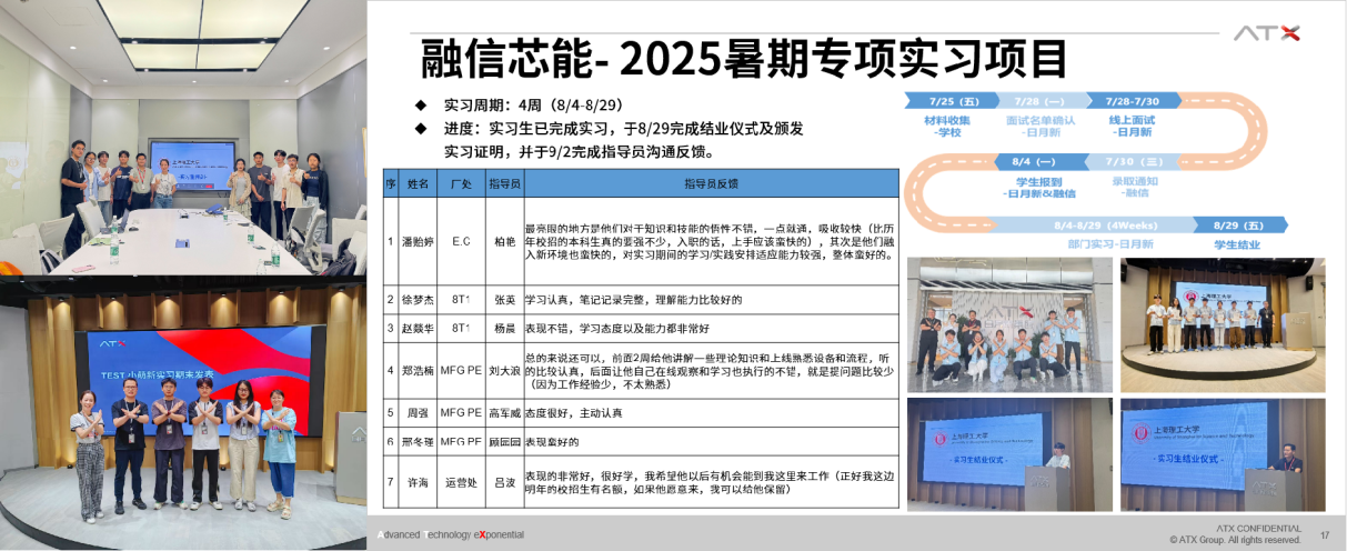 同期,上海理工大学-苏州日月新半导体封测专项班研究生在企业导师“一对一”带教下,精准对接先进封装、产品测试、可靠性测试、研磨切割等岗位。封装岗位的学生则扎根研磨切割、SMT贴片、WB等前道核心工艺环节,在实际操作中学习标准作业程序,理解全链条质量管理的重要性和实施方法。测试岗位的同学系统学习Final Test全流程,深入理解射频芯片测试、开路短路测试、直流参数测试等关键技术细节。结业仪式上,学生代表表示深刻体会到了封测产业中“工程智慧藏于细节,良率把控在于全局”。同时,企业主管邱学文高度认可同学们展现出的专业素养、学习能力和执行力以及大家在跨部门协作中的积极表现。