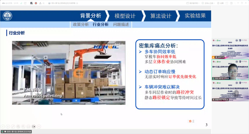 9月14日,2025年第十二届上海市大学生工业工程应用与创新大赛总决赛成功举办。本次大赛由上海市教委主办,上海市机械工程学会、上海市机械工程学会工业工程专业委员会、上海市管理科学学会物流与供应链管理专业委员会、上海理工大学管理学院联合承办,以线上会议形式召开,为进一步推动工业工程专业深化产教融合、强化协同育人提供平台支撑。教育部工业工程类专业教指委副主任、上海市机械工程学会工业工程专业委员会主任、上海交通大学特聘教授江志斌,上海理工大学管理学院党委书记马静波,上海市大学生工业工程应用与创新大赛主席、上海理工大学教授叶春明出席并致辞。大赛由管理学院工业与系统工程系主任刘勤明主持。