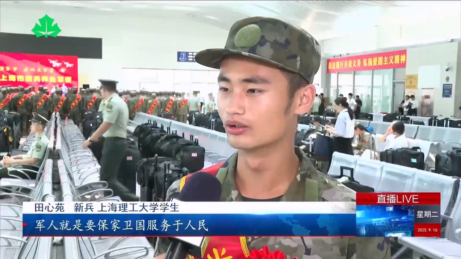 9月16日,上海市市委、市政府、上海警备区在上海火车站举行新兵欢送仪式,我校基础学院入伍大学生田心苑接受上海教育电视台采访,在采访中,田心苑表示:“军人就是要保家卫国服务于人民,相信在部队的历练下,我也可以很好地履行这份责任,为国家贡献出自己的力量。”