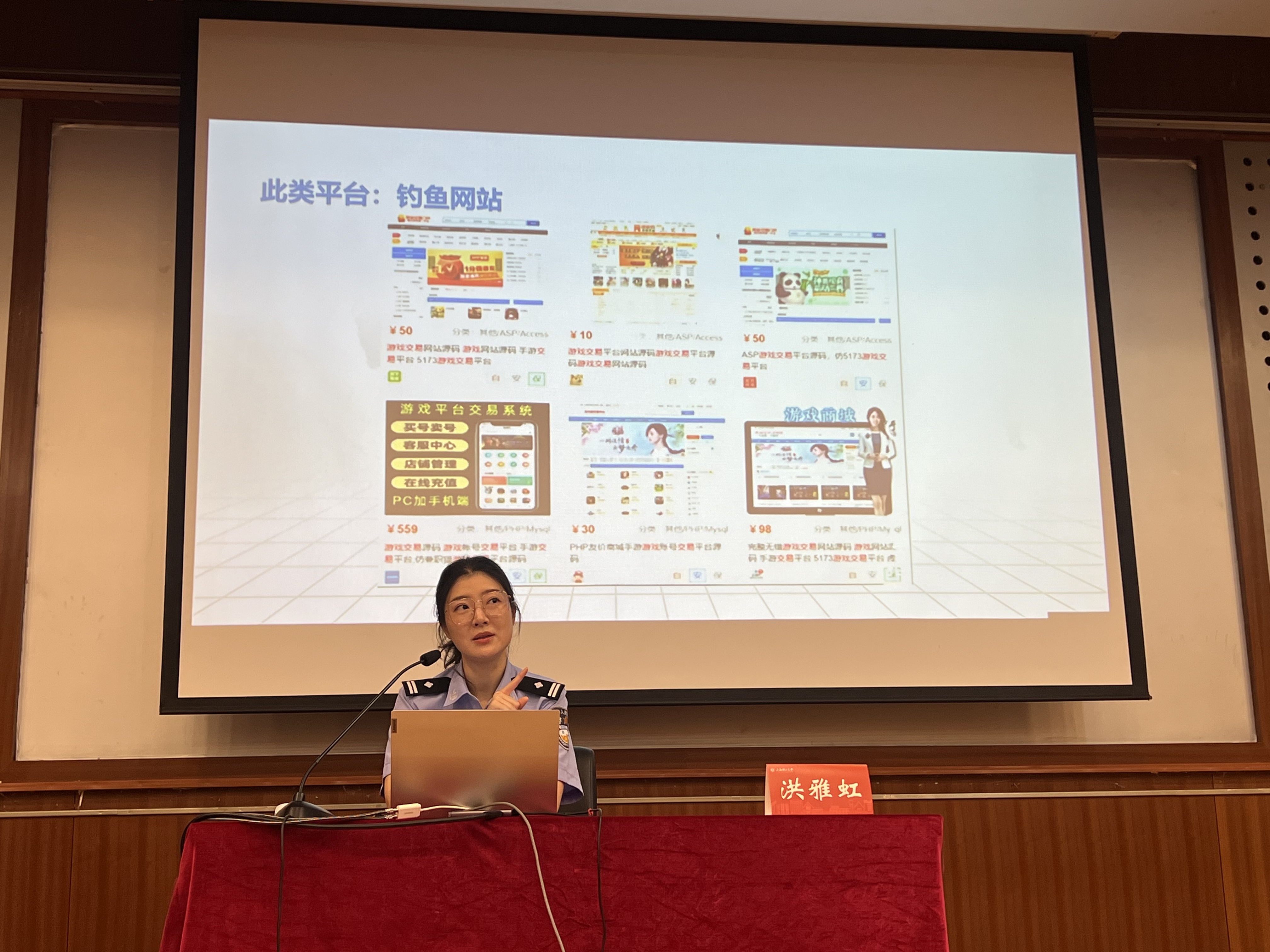 最后,市公安局刑侦总队三级警长洪雅虹为新生们带来了一场生动实用的反诈宣传讲座。她详细介绍了当前高发的电信网络诈骗类型及其防范要点,并结合大学生群体中多见的兼职刷单、冒充客服、虚假购物及校园贷等真实案例,进行了深入浅出的剖析。洪警官提醒同学们务必保持警惕,加强个人信息保护意识,切实提高辨别与应对诈骗的能力,在大学校园里平安、顺心地度过学习生活。