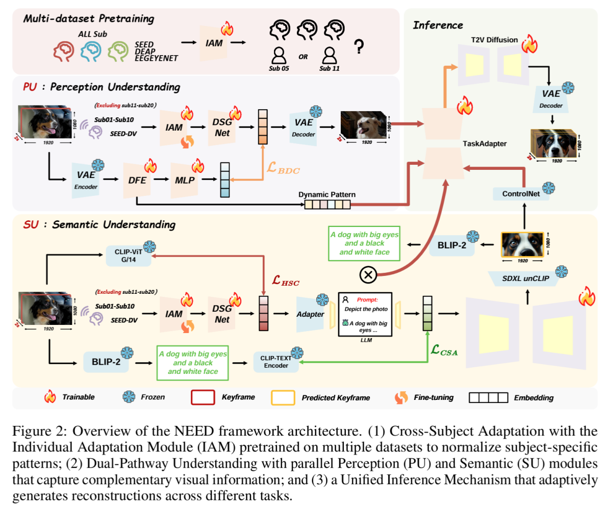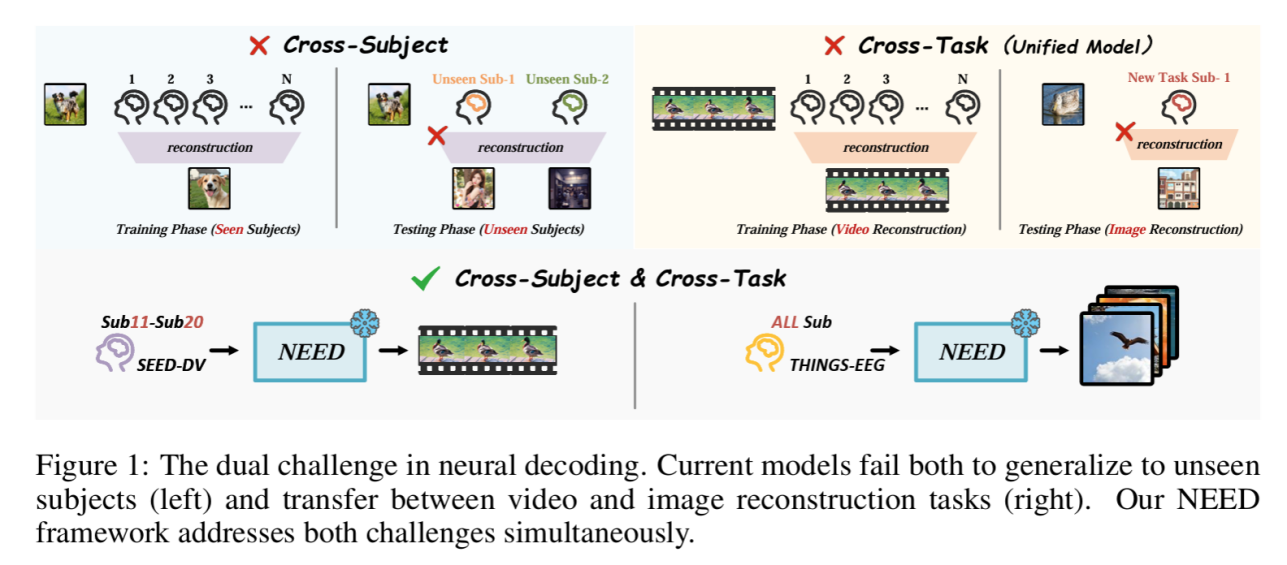 将大脑活动转化为有意义的视觉内容长期以来一直被认为是神经科学和脑机接口研究的基本挑战。基于脑电图的神经解码的最新进展显示出良好的前景,但该领域仍然存在两个关键限制:跨受试者的泛化能力差以及对特定视觉任务的限制。基于此,研究团队提出了NEED模型,是第一个实现了零样本跨受试者和跨任务泛化的基于脑电图的视觉重建统一框架。研究工作展示了神经解码如何跨越受试者和任务界限,为走向真正可推广的脑机接口做出重要贡献。