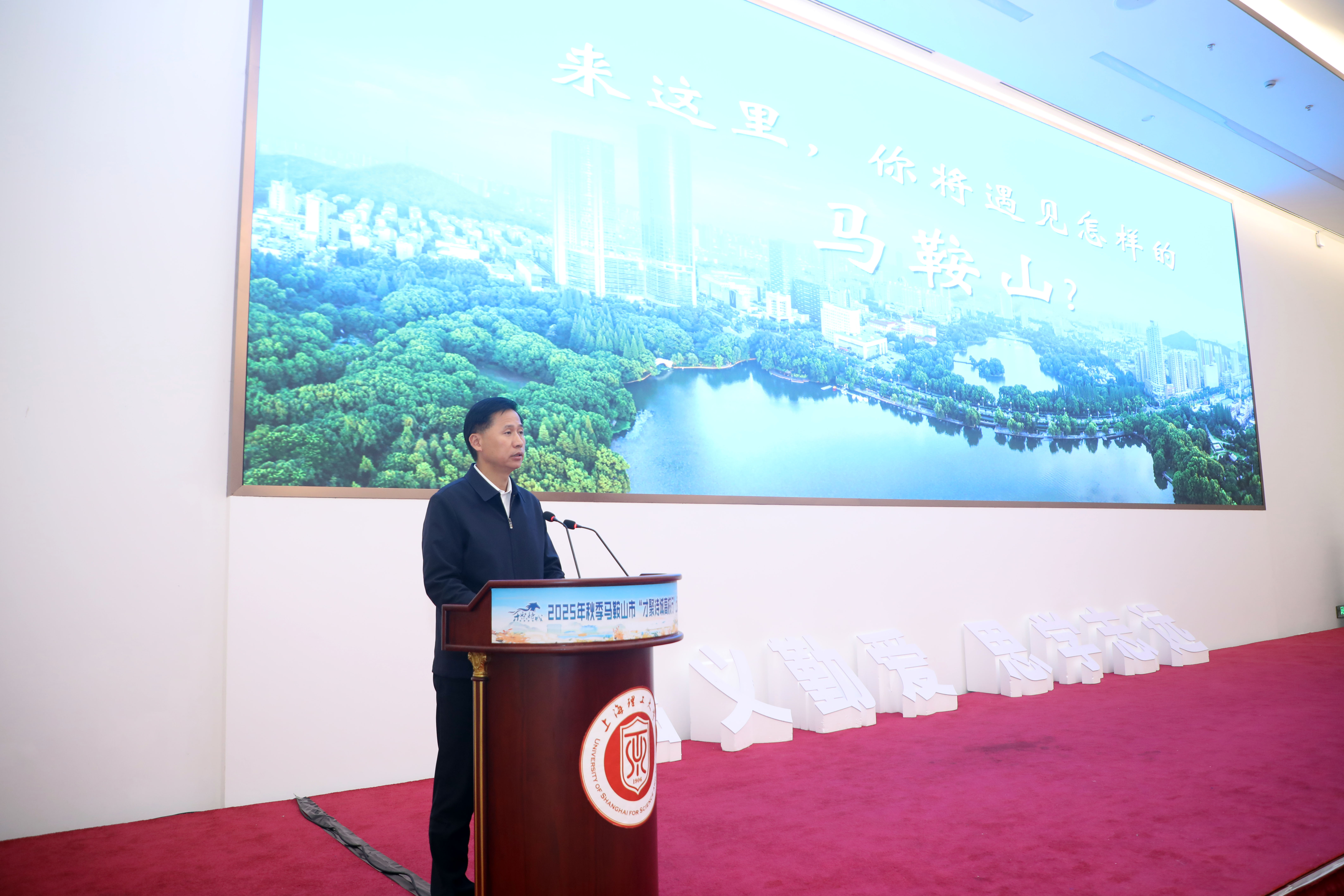 11月6日下午,马鞍山市2025年秋季“才聚诗城高校行”系列活动在我校举行。马鞍山市人民政府党组成员、副市长左年文,市委组织部副部长、市委人才工作局局长丁镠,市人社局党组书记、局长陈宏艳,市科技局党组成员、市科技成果转移转化服务中心池本军,市人才服务中心主任荀峰,市科创和人才发展集团总经理季毓等出席活动。校党委副书记贺莉,学工部、研工部、科研院、光电学院、机械学院、环建学院等部门及学院负责人,2026届毕业生共同参加活动。