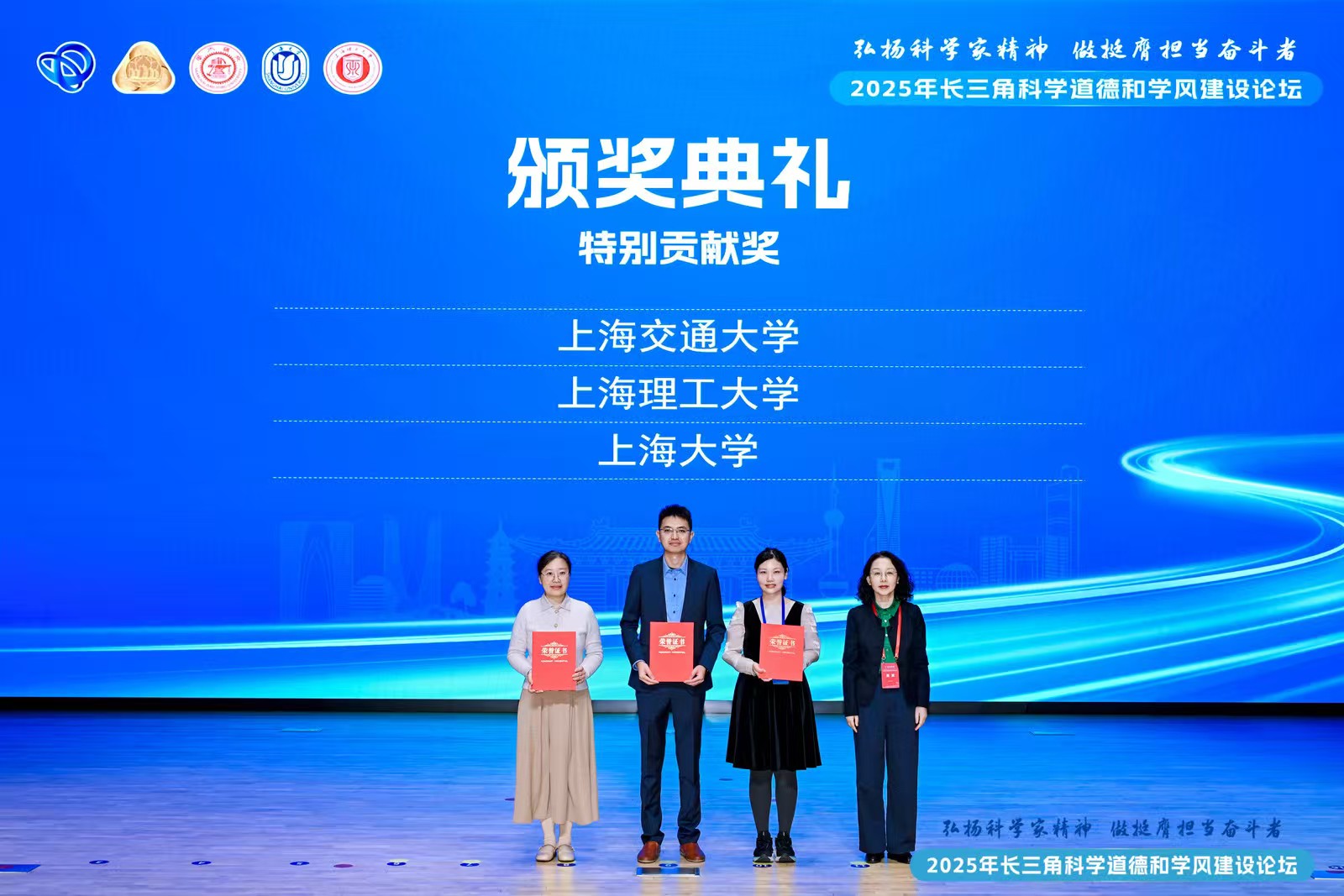 11月11日,在上海交通大学举办的“2025年长三角科学道德和学风建设论坛”上,上海理工大学再次荣获“特别贡献奖”,仅3个高校获此荣誉。来自全国30余所高校和科研院所的师生代表共同参与本次论坛,上海市科学技术协会、市教育委员会相关领导出席。我校研究生工作部副部长、研究生院副院长王张琦带队参加。