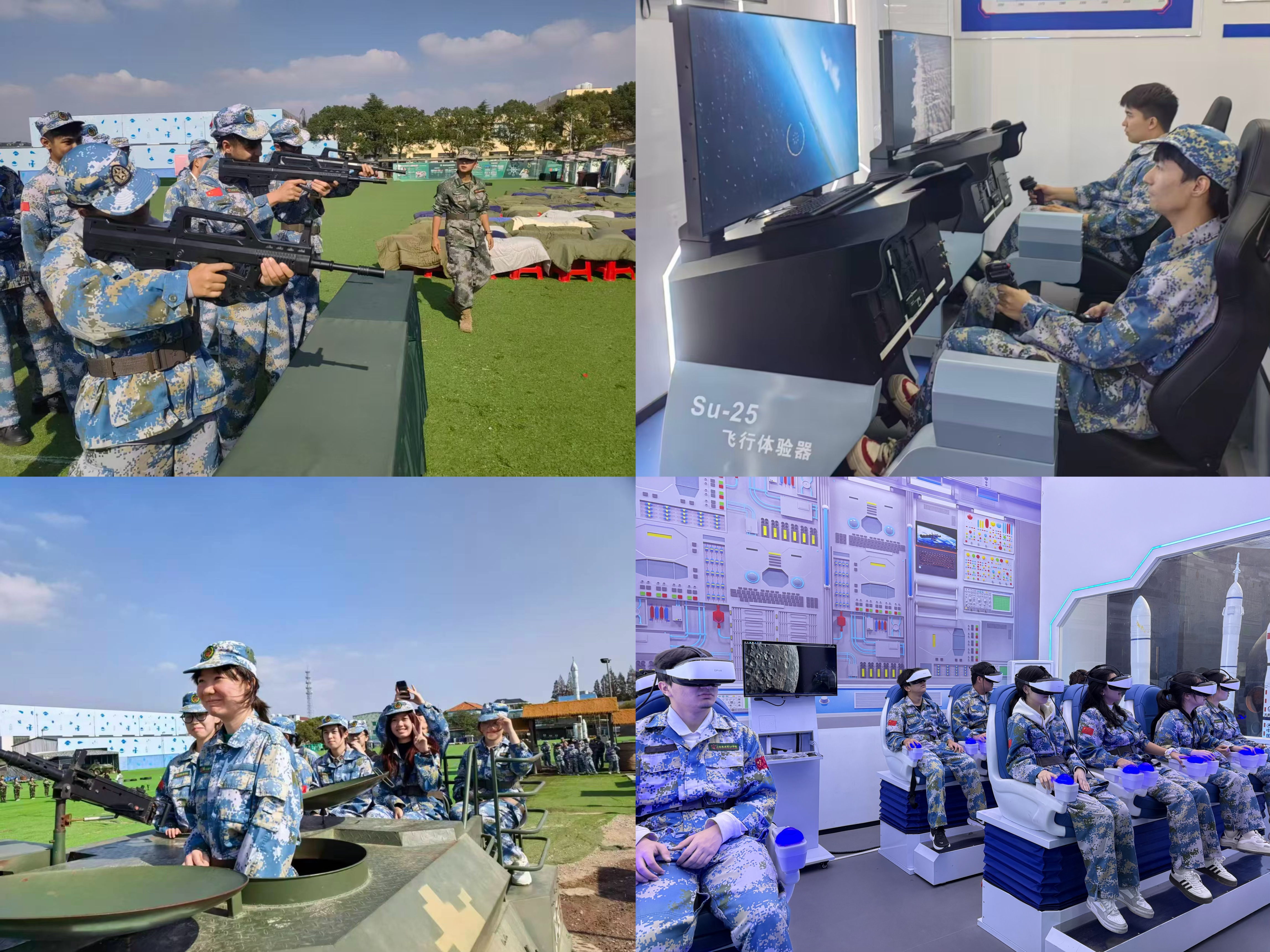 陆军实战体验环节,学子们在专业教官带领下锤炼硬核本领。CQB战术对抗中,大家分组运用战术手语协同作战,体会团队协作的重要性;95式步枪模拟射击让同学们掌握瞄准技巧与安全规范,激发争先创优的斗志;乘坐军用装甲车穿越模拟战场时,直观感受国防装备的硬核实力。航空航天展览馆内,“两弹一星”精神的专题讲解结合实物模型,让科技强军的理念深入人心;VR太空漫游与战斗机模拟驾驶体验,点燃科技报国的热情。
