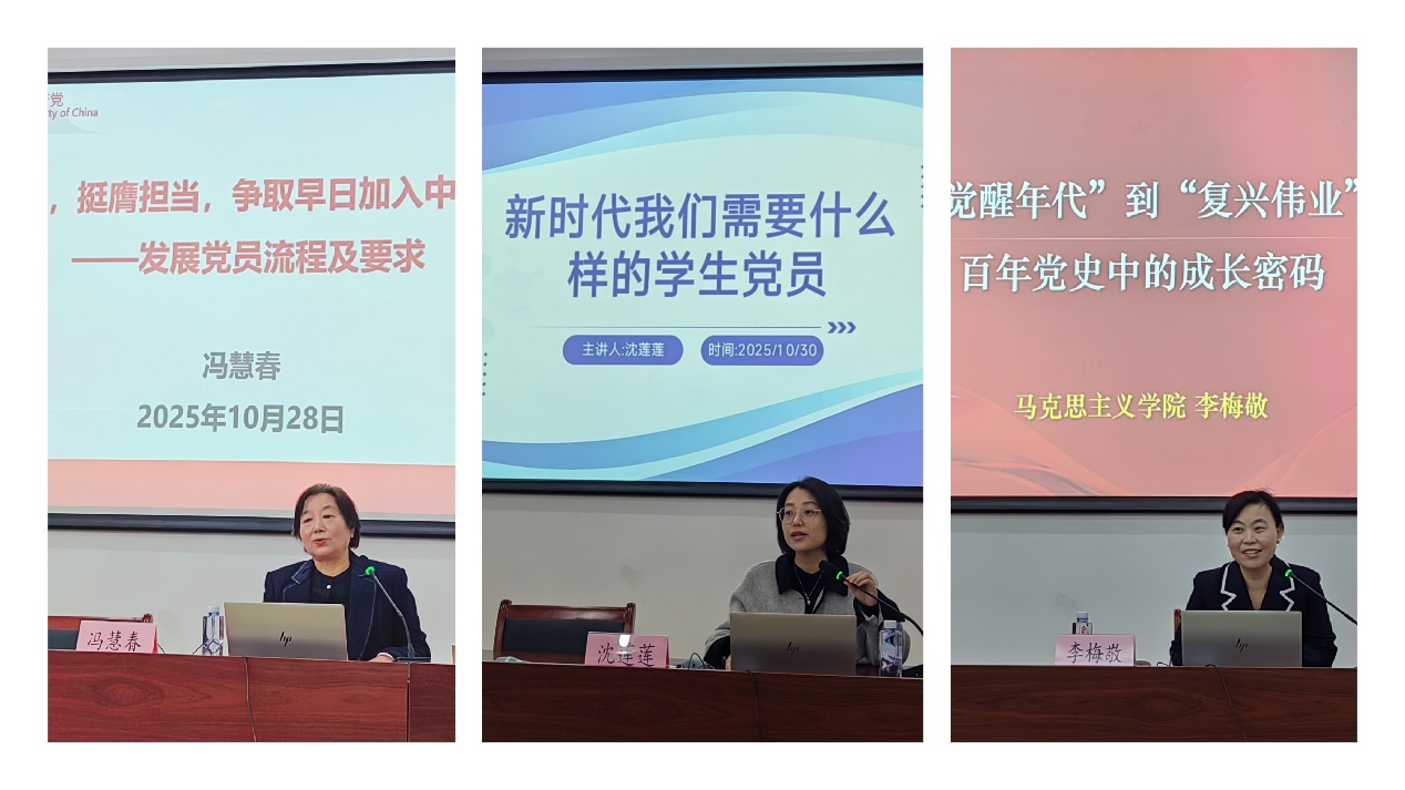 三场讲座中,冯慧春以习近平总书记对青年的寄语为引,深入讲解了《中国共产党章程》的核心要义,细致阐述了从申请入党到转正的完整流程,并引导学员思考如何将个人成长融入国家发展大局。沈莲莲则聚焦“新时代我们需要什么样的学生党员”这一命题,从时代背景、核心素养、纪律要求与使命担当四个维度展开论述。她特别结合外语专业特色,勉励学员夯实专业根基、坚定理想信念,努力成为用外语“讲好中国故事、争夺国际话语权”的先锋力量。李梅敬以“觉醒年代”至“新时代”的宏大历史脉络为主线,系统梳理了中国共产党百年奋斗的光辉历程。通过深入浅出的讲解,她引导学员们深刻领悟“中国共产党为什么能”的历史逻辑与实践真谛,坚定了学员们为民族复兴贡献力量的信念。