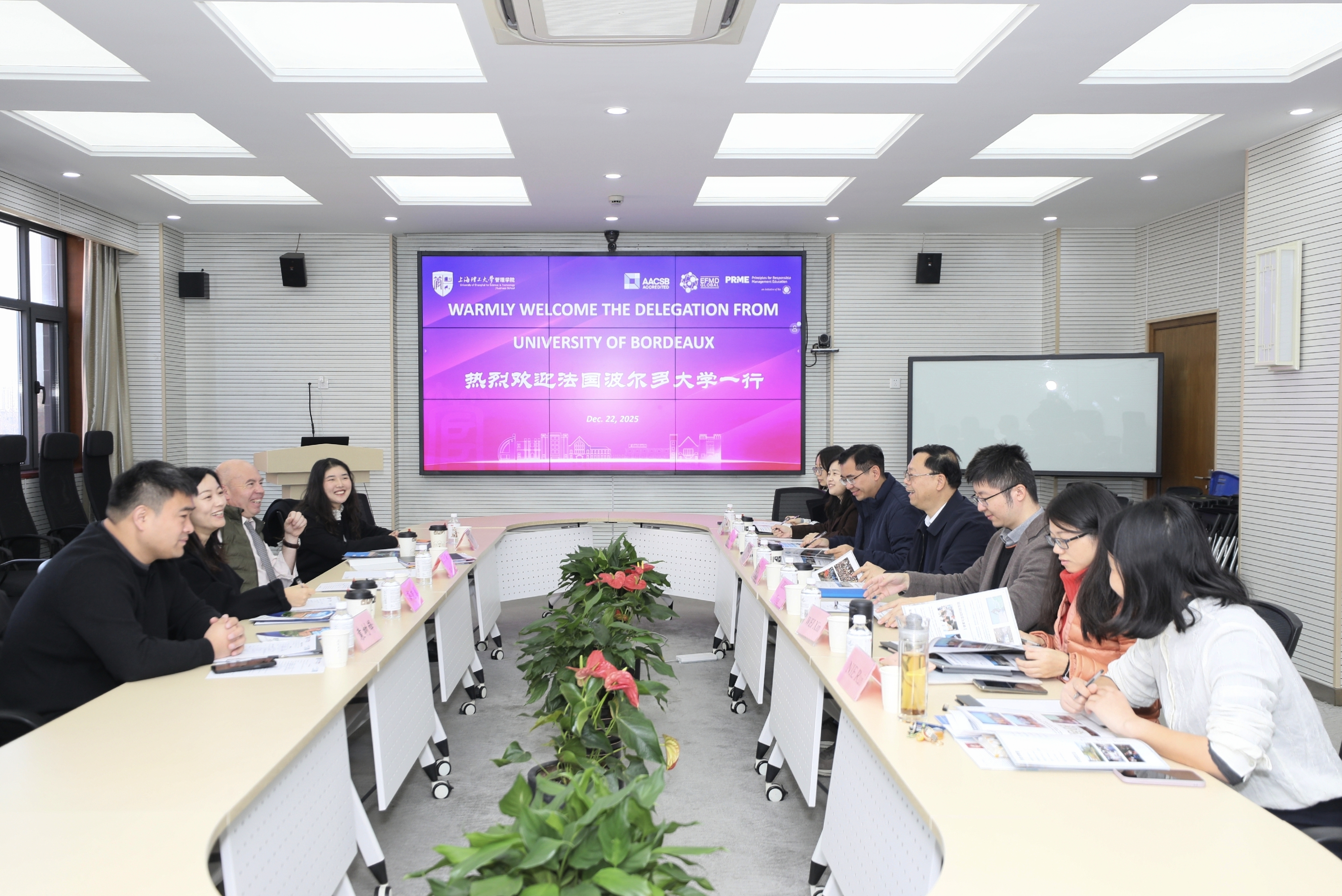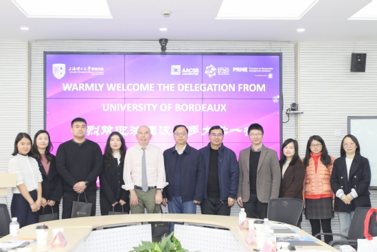 12月22日上午,法国波尔多大学经济管理学院院长贝特朗·布朗顿,对中事务及AASF中法高校联合培养计划负责人曾祺,对中校级合作主管袁树锋,对中事务专员薛晓春等一行来访上海理工大学管理学院。管理学院院长赵来军,副院长赵靖、刘魏巍,学校国际交流处国际交流科科长刘媛,管理学院国际化办公室主任谢伟等共同参加会谈。会谈由刘魏巍主持。
