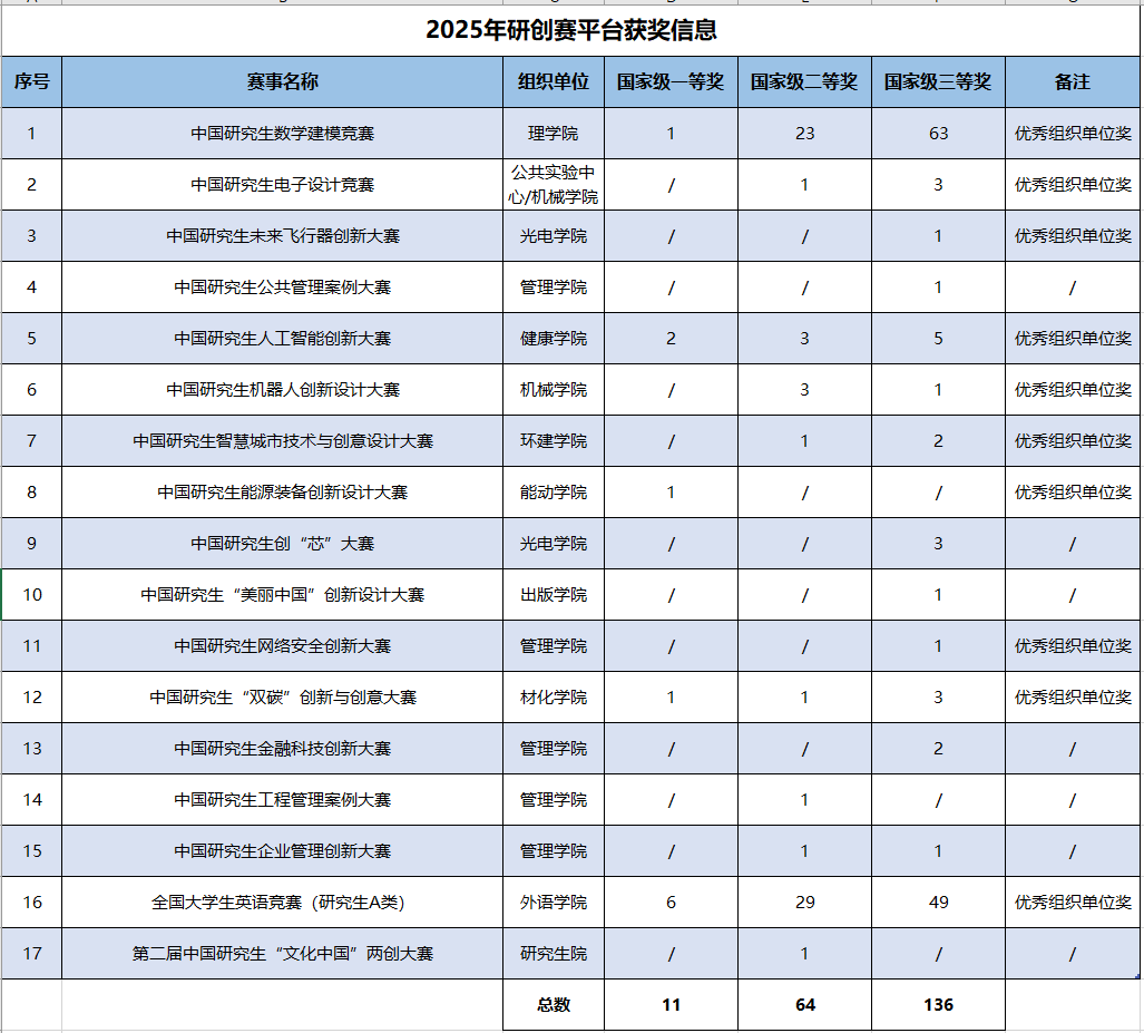 其中,理学院承办的2025年“华为杯”第二十二届中国研究生数学建模竞赛,上理工共1341支队伍参赛,最终获一等奖1项、二等奖23项、三等奖63项,上理工获“优秀组织单位”和“先进个人”荣誉,并以得分第一位居“优秀组织单位”榜首。能动学院、光电学院、管理学院、公共实验中心/机械学院、外语学院、环建学院、健康学院、理学院、材化学院等承办的10个主题赛事获“优秀组织单位”奖。其中,中国研究生智慧城市技术与创意设计大赛和中国研究生网络安全创新大赛首次获得“优秀组织单位奖”。中国研究生未来飞行器创新大赛、中国研究生公共管理案例大赛、中国研究生金融科技创新大赛、中国研究生“文化中国”两创大赛等4个平台实现了国奖零的突破。中国研究生人工智能创新大赛、中国研究生能源装备创新设计大赛、中国研究生“双碳”创新与创意大赛等3个平台实现了国家级一等奖的突破。此外,在2025年全国大学生英语竞赛中,我校研究生获国家级一等奖6人、二等奖29人、三等奖49人。